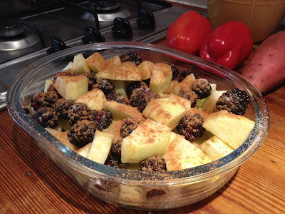 - Put the blackberries over the apple, making sure there are some all over the dish.